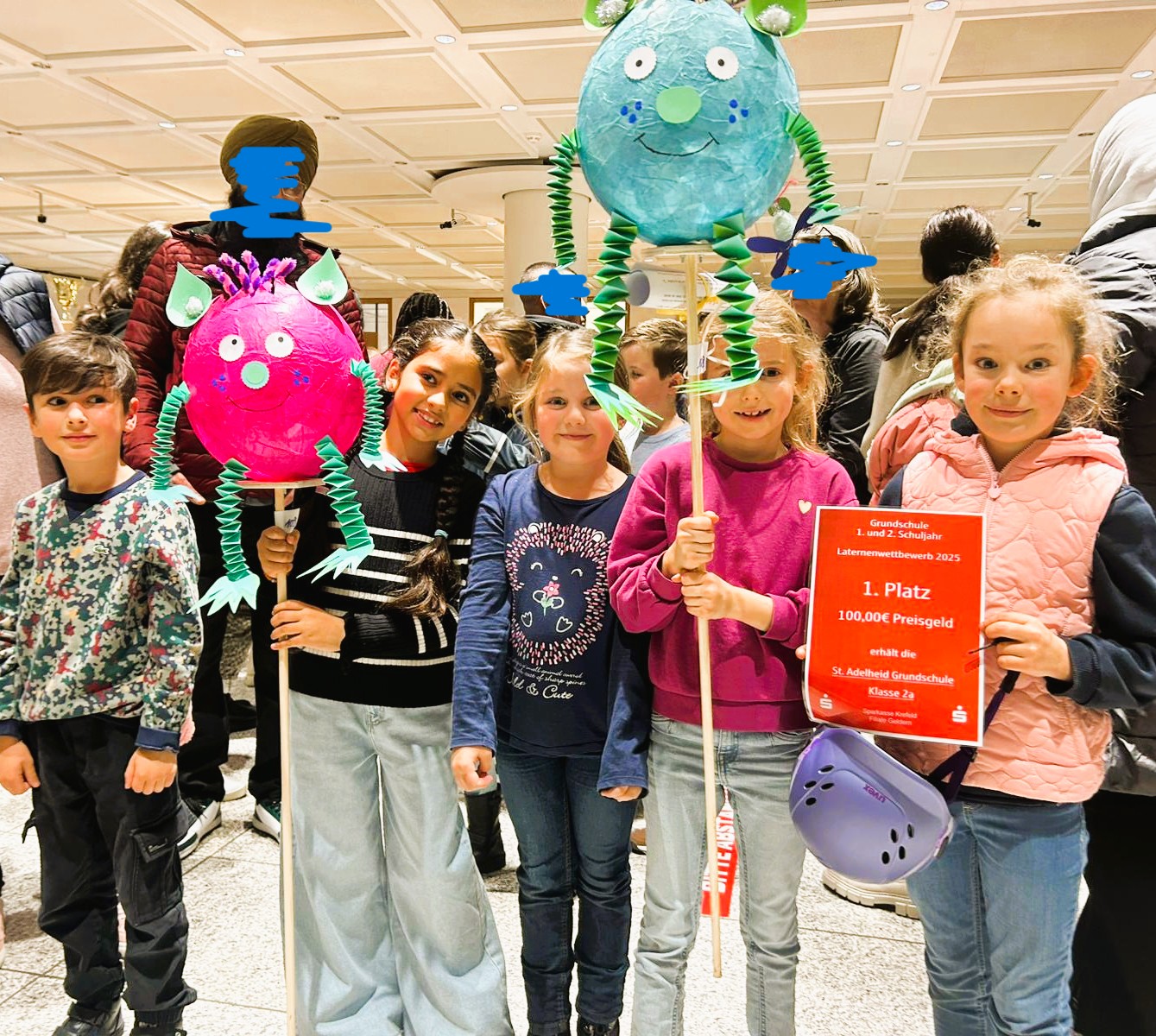 Bereits vor den Herbstferien begannen an unserer Schule die Vorbereitungen für die diesjährigen Martinslaternen. In den Klassen wurde fleißig gekleistert, geschnitten, geklebt und geprickelt. Die eine oder andere Klasse nahm am von der Sparkasse organisierten Laternenwettbewerb teil. Die Siegerehrung fand am Mittwochnachmittag (05.11.) statt. Die Klasse 2a von Frau Lynders erreichte mit ihren „Lichtis“ den ersten Platz unter den ersten und zweiten Klassen der teilnehmenden Grundschulen. Wir gratulieren zu dieser tollen Platzierung und freuen uns auf die Ausstellung dieser und vieler anderer Laternen beim Martinsleuchten (06.11.) an unserer Schule.